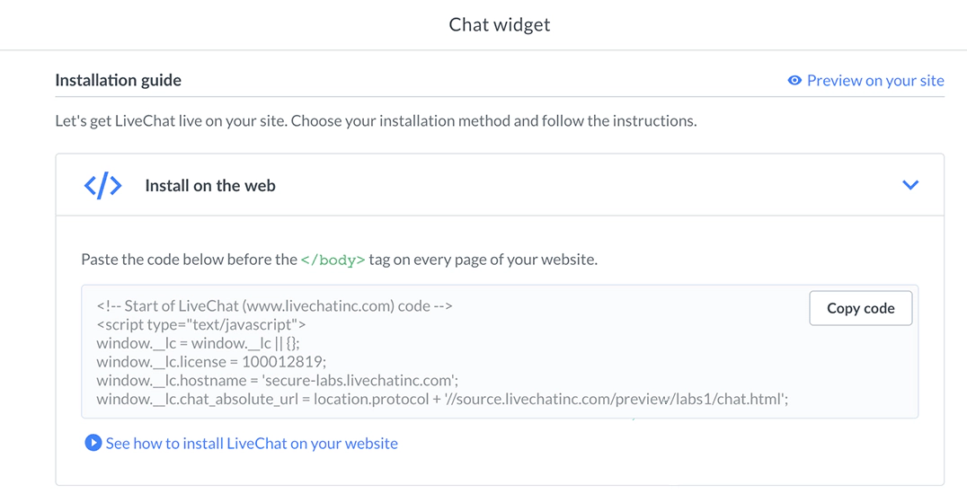 In your LiveChat account, open the Agent App and head to Settings → Channels → Chat widget and use the copy code option to grab your installation snippet.